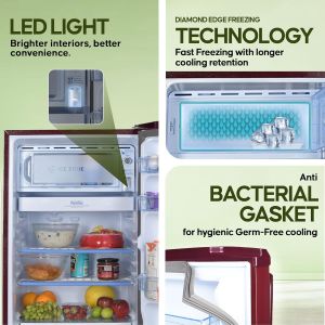 - Interior Description: Fridge with Fresh Food Capacity : 151 Ltr | Freezer Capacity : 14 Ltr | Total no. of compartments : 1 | Shelves : 2 | Vegetable Drawers : 1 | Shelf Type : Wired Shelves | Single Door Refrigerator with Anti Bacterial Gasket.