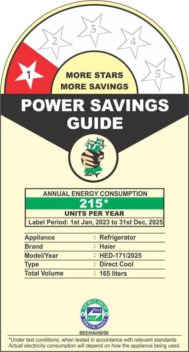 - Energy Rating: 1 Star Single Door Refrigerator - Energy Efficiency | Annual Energy Consumption: 215 KWH.