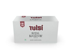 Indulge in the exquisite taste of Royal Khajoor Plus silver-coated dates from Tulsi. These premium quality dates are carefully selected and adorned with a lustrous silver coating, making them perfect for special occasions and festive gifting. The elegant silver finish adds a touch of luxury to these naturally sweet and nutritious dates. The convenient resealable packaging helps maintain freshness and makes storage simple. These dates make for a sophisticated treat that combines traditional flavour with modern presentation, ideal for serving to guests or enjoying as a refined snack. The striking combination of the dates' natural sweetness and their silver coating creates a unique delicacy that stands out in both taste and appearance.