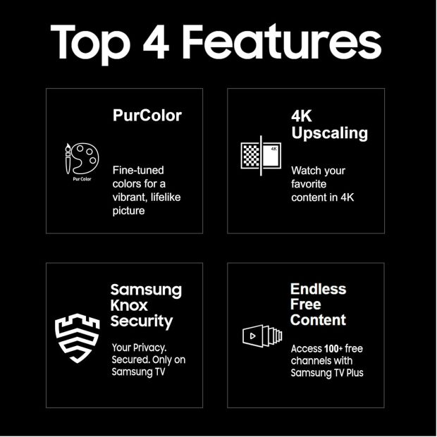 - Display Features: Crystal Processor 4K | PurColor | 4K Upscaling | HDR 10+ Support | HDMI Black Level | Mega Contrast | UHD Dimming | Contrast Enhancer | Motion Xcelerator | Filmmaker Mode || Additional Features: Endless Free Content | Samsung Knox Security (Your privacy. Secured.) | ConnectShare | TV Key