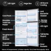 - Interior Description : Fresh Food Capacity : 183 Ltr | Freezer Capacity : 53 Ltr | Total no. of compartments : 2 | Shelves : 3 | Vegetable Drawers : 1 | Shelf Type : Toughened Glass Shelves | Anti Bacterial Gasket |