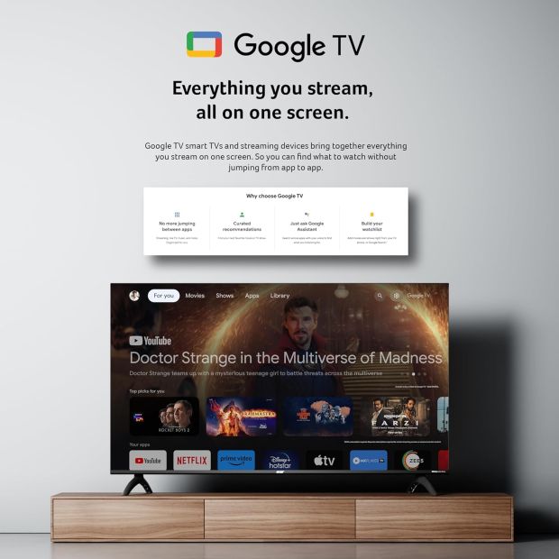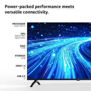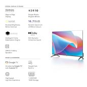 - Smart TV Features: Google TV with Android 14 | Content Recommendations | Dual Band WiFi | Bluetooth 5.0 | Casting option- Googlecast, Fastcast, Meeting mode | 1.5GB RAM | 16GB Storage | Watchlist | Personal Profile | Kids Profile | Google Assistant | Voice enabled Smart Remote | Hotkeys for Quick Access - Netflix, Prime Video, YouTube, Disney+Hotstar | Quad Core Processor | Screen Saver |