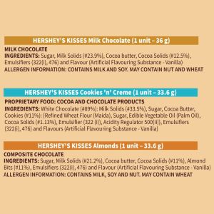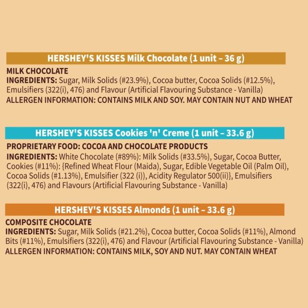 Hershey's Kisses Almonds: Ingredients: Sugar, Milk Solids (#21.2%), Cocoa butter, Cocoa Solids (#11%), Almond Bits (#11%), Emulsifiers (322(i), 476) and Flavour (Artificial Flavouring Substance - Vanilla) Hershey's Kisses Creamy Milk: Sugar, Milk Solids (#23.9%), Cocoa butter, Cocoa Solids (#12.5%), Emulsifiers (322(i), 476) and Flavour (Artificial Flavouring Substance - Vanilla) Hershey's Kisses Cookies 'N' Creme: Ingredients: White Chocolate (#89%): Milk Solids (#33.5%), Sugar, Cocoa Butter, Cookies (#11%): {Refined Wheat Flour (Maida), Sugar, Edible Vegetable Oil (Palm Oil), Cocoa Solids (#1.13%), Emulsifier (322 (i)), Acidity Regulator 500(ii)}, Emulsifiers (322(i), 476) and Flavours (Artificial Flavouring Substance - Vanilla)
