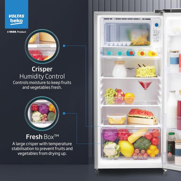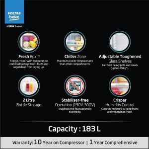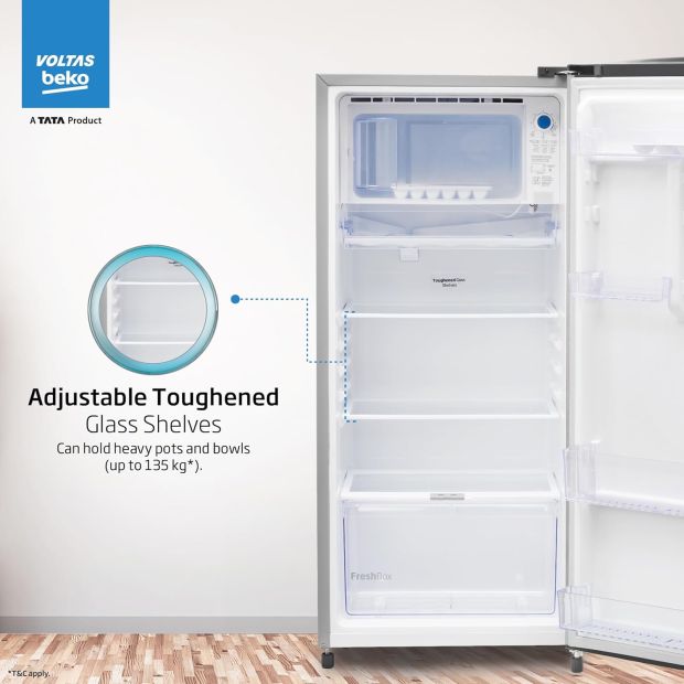The Voltas Beko 183 liter 3 Star single door Direct cool refrigerator features a convinient base drawer for storing dry vegetablaes like potatos and onions. It has 3 star energy rating, ensuring efficient performance and low power consumption. The refrigerator is equipped with toughened glass shelves and large bottle shelf for convininet storage. its sleek design adds a touch of elegance to your kitchen.