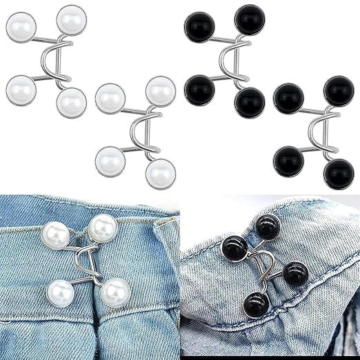 Package Content Jeans tightening clips : Two sets of jean button pins for loose jeans pants are included. Four pearl pins and one pair of hooks make up one set.Installing the white button by hand is simple and doesn't require any sewing or tools. Adjustable Jeans Button Pins act as jeans button for loose jeans clip which does not Need to Sew Jeans Button Needles. These jeans button pins for women are adjustable and act as instant fit on jeans.