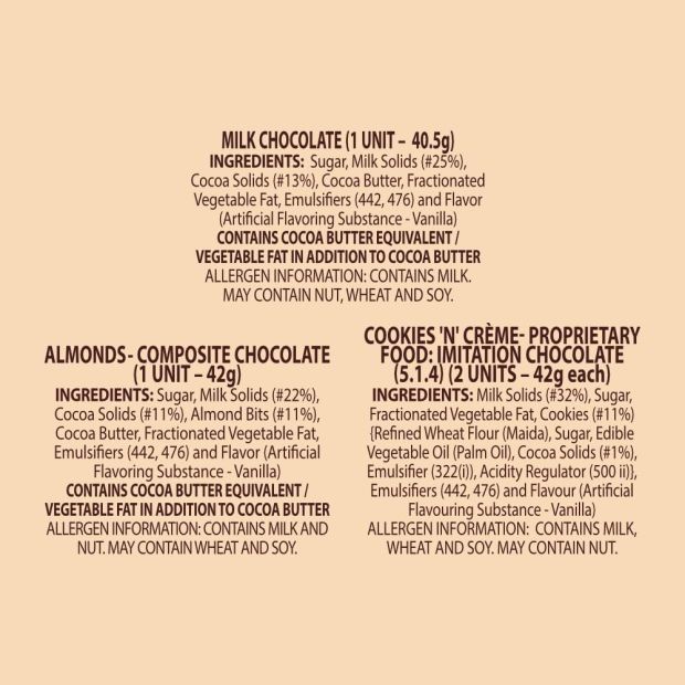 - 2.Assortment of deliciousness A variety of crunchy, creamy textures. 3 units inside - Milk Chocolate (1 Unit), Almonds (1 Unit), Cookies 'n' Crème (1 Unit)