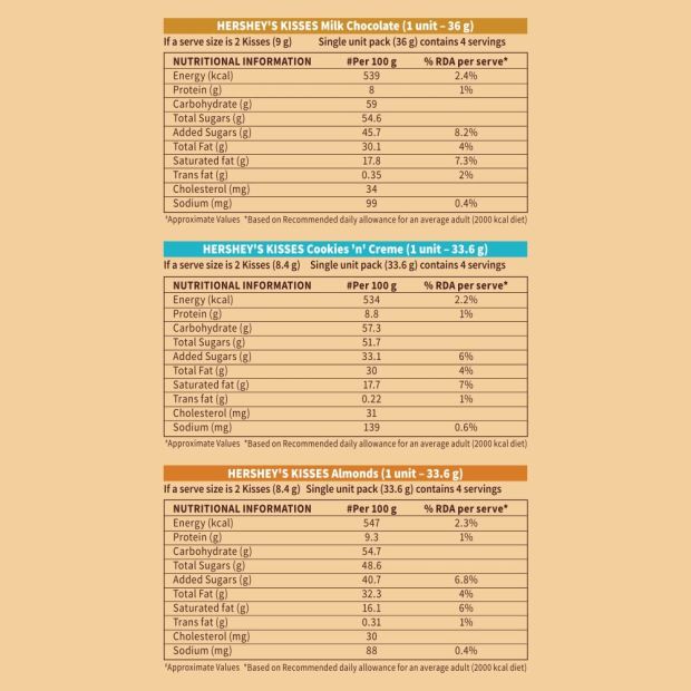 Hershey's Kisses Almonds: Ingredients: Sugar, Milk Solids (#21.2%), Cocoa butter, Cocoa Solids (#11%), Almond Bits (#11%), Emulsifiers (322(i), 476) and Flavour (Artificial Flavouring Substance - Vanilla) Hershey's Kisses Creamy Milk: Sugar, Milk Solids (#23.9%), Cocoa butter, Cocoa Solids (#12.5%), Emulsifiers (322(i), 476) and Flavour (Artificial Flavouring Substance - Vanilla) Hershey's Kisses Cookies 'N' Creme: Ingredients: White Chocolate (#89%): Milk Solids (#33.5%), Sugar, Cocoa Butter, Cookies (#11%): {Refined Wheat Flour (Maida), Sugar, Edible Vegetable Oil (Palm Oil), Cocoa Solids (#1.13%), Emulsifier (322 (i)), Acidity Regulator 500(ii)}, Emulsifiers (322(i), 476) and Flavours (Artificial Flavouring Substance - Vanilla)