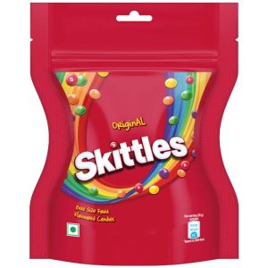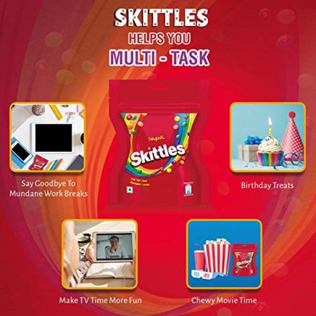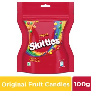Ingredients: Sugar, Glucose Syrup, Palm Oil, Activity Regulators (INS 330, INS 331(iii)), Dextrin, Modified Starch, Colours (Titanium Dioxide, Tartrazine, Allura Red, Sunset Yellow, Indigo Carmine, Brilliant Blue), Glazing Agent (Carnauba Wax), Triglycerides. Legal Disclaimer: Actual product packaging and materials may contain more and different information than what is shown on our app or website. We recommend that you do not rely solely on the information presented here and that you always read labels, warnings, and directions before using or consuming a product. Product description Why this candy? Sweets are meant to be an inevitable part of every special occasion, but premium imported candies makes sure you have an amazing end to the year. Skittles fruit candies is is all you need to make this Christmas & New year bright, fun, and full of sweetness. These Christmas candies lets you find out your own funny bits and create a world where people laugh more and are not scared of trying anything unique. What makes it different? Skittles, with its distinctive rainbow colours and fruity flavours makes all your moments super fun and your mood, comic! These bite-sized candies with their colourful nature give you the chance to taste the rainbow and delight your loved ones. Each candy lentil is made of a crisp sugar shell and is flavoured in lemon, apple, grape, strawberry and orange tangs. When to have these candies? There is no one way to have fun with these candies, enjoy them while working from home, in-between your movie marathon or use them as new year candies for your loved ones or Christmas gift for friends. Add the wonderful flavours of Skittles fruit candy to your candy buffet or to your favourite dessert! Altogether curated with love, this joyful candy pack is perfect to bring a Merry laughter to your day. A celebration pack meant to spread happiness, this candy is a perfect happy new year gift for family or can be added in your Christmas chocolate box. So, spread happiness by bidding goodbye to this year with candies, hope, and a whole lot of fun! Also try, Skittles wild berry with its sour taste to strike it up a notch. Hit the rainbow with Skittles candies.